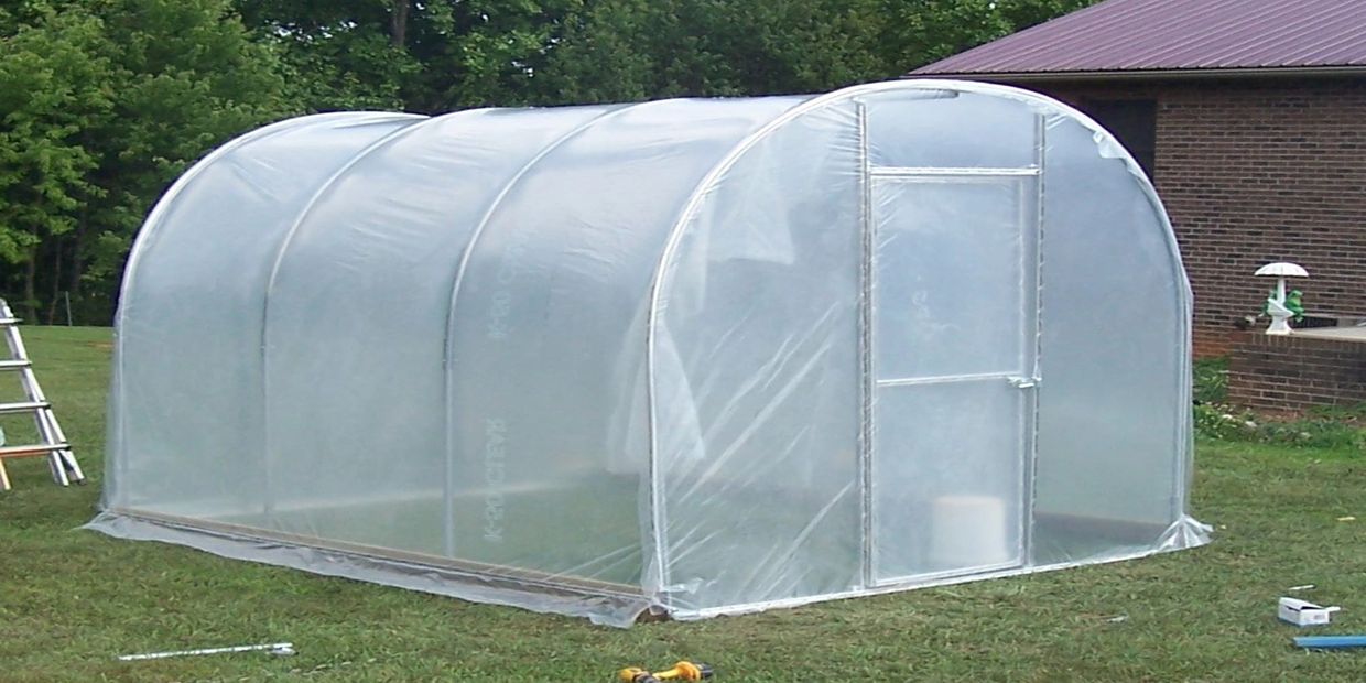 A Hobby Greenhouse measuring 9' X 12' with an 8' high center and a walk-in door. The frame for this Hobby Greenhouse is made of 1 3/8" 13-15-16 gauge allied Gator Shield Tubing (made in the USA).
